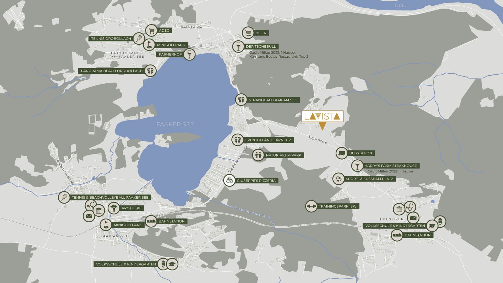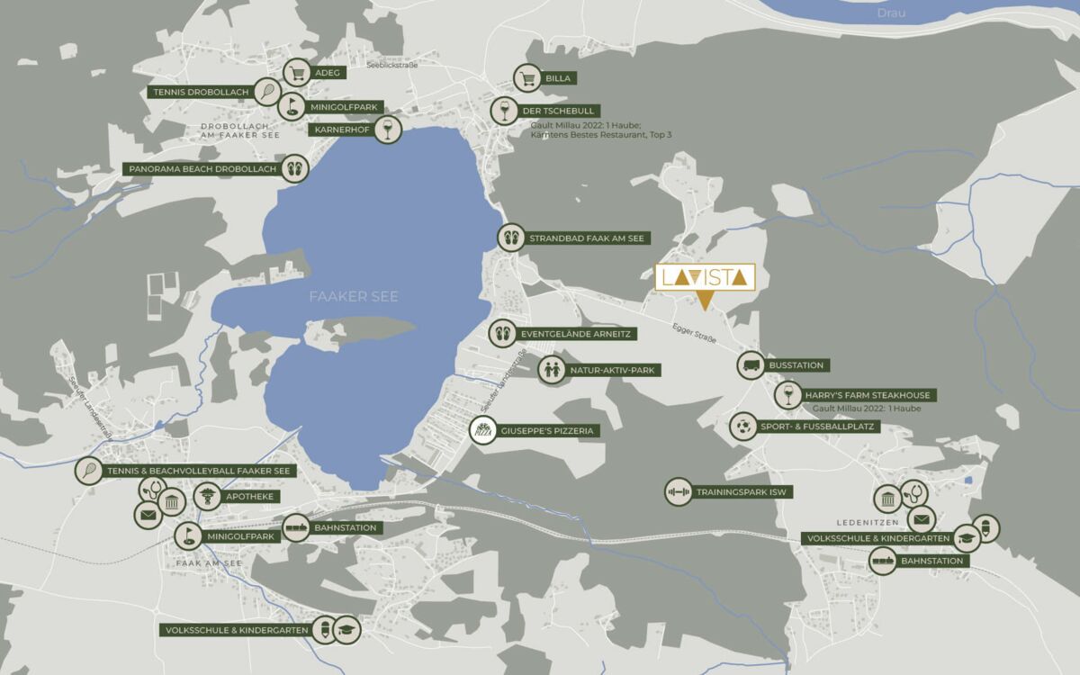 Ihr Zuhause im LAVISTA beim Faaker See ist der ideale Ausgangspunkt für Ihren Arbeits- und Alltag. In nicht einmal 15 Minuten erreichen Sie ganz schnell die Villacher Innenstadt. Renommierte Unternehmen, viele Arbeitsplätze, zahlreiche Einkaufs- und Freizeitmöglichkeiten befinden sich am Weg dorthin und in der nahen Umgebung. Attraktive Ausflugziele – ob Berge, Seen oder das benachbarte Ausland – liegen zum Greifen nah. Wo Sie wohnen, machen andere Urlaub. Nur: Sie wohnen noch viel ruhiger. Und viel grüner.